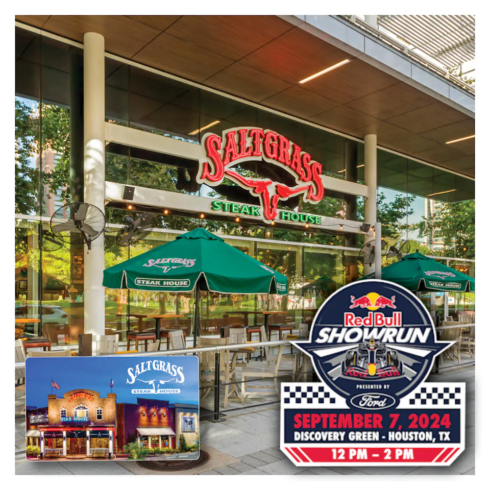 7. PRIZES. One (1) winner will be selected to receive a $50 Dollar ($50) SALTGRASS STEAK HOUSE Gift Card and two (2) tickets to the Red Bull Showrun Houston at the end of the Promotion Period (“Gift Card” or “Prize”). The total approximate retail value of the Prize is $150 USD. Sponsor reserves the right to sell or distribute the unclaimed Prizes at Sponsor’s sole and absolute discretion. Certain locations operating under Landry’s brands are franchised locations and therefore may or may not accept or redeem Landry’s Gift Cards issued by Sponsor. The Gift Card may be used only for purchases within the United States and must be used in accordance with the Landry’s Gift Card Terms and Conditions then in place. Except where prohibited by law, the Gift Card may not be redeemed for cash. Gift Cards have no cash or other currency redemption value. The value of a Gift Card that is lost, stolen, destroyed, altered or used without the owner’s permission will not be replaced or refunded. All other costs and expenses which are not specifically listed as part of a prize in these Official Rules and which may be associated with the award, acceptance, receipt and use of the Prizes are solely the responsibility of the respective winner. ALL FEDERAL, STATE AND LOCAL TAXES ASSOCIATED WITH THE RECEIPT OR USE OF ANY PRIZE ARE SOLELY THE RESPONSIBILITY OF THE WINNER.